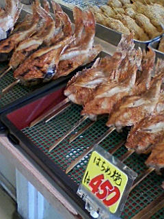 豪快な鯖の丸焼きと↑はちめ焼き、イカの姿焼きを2本買いました。